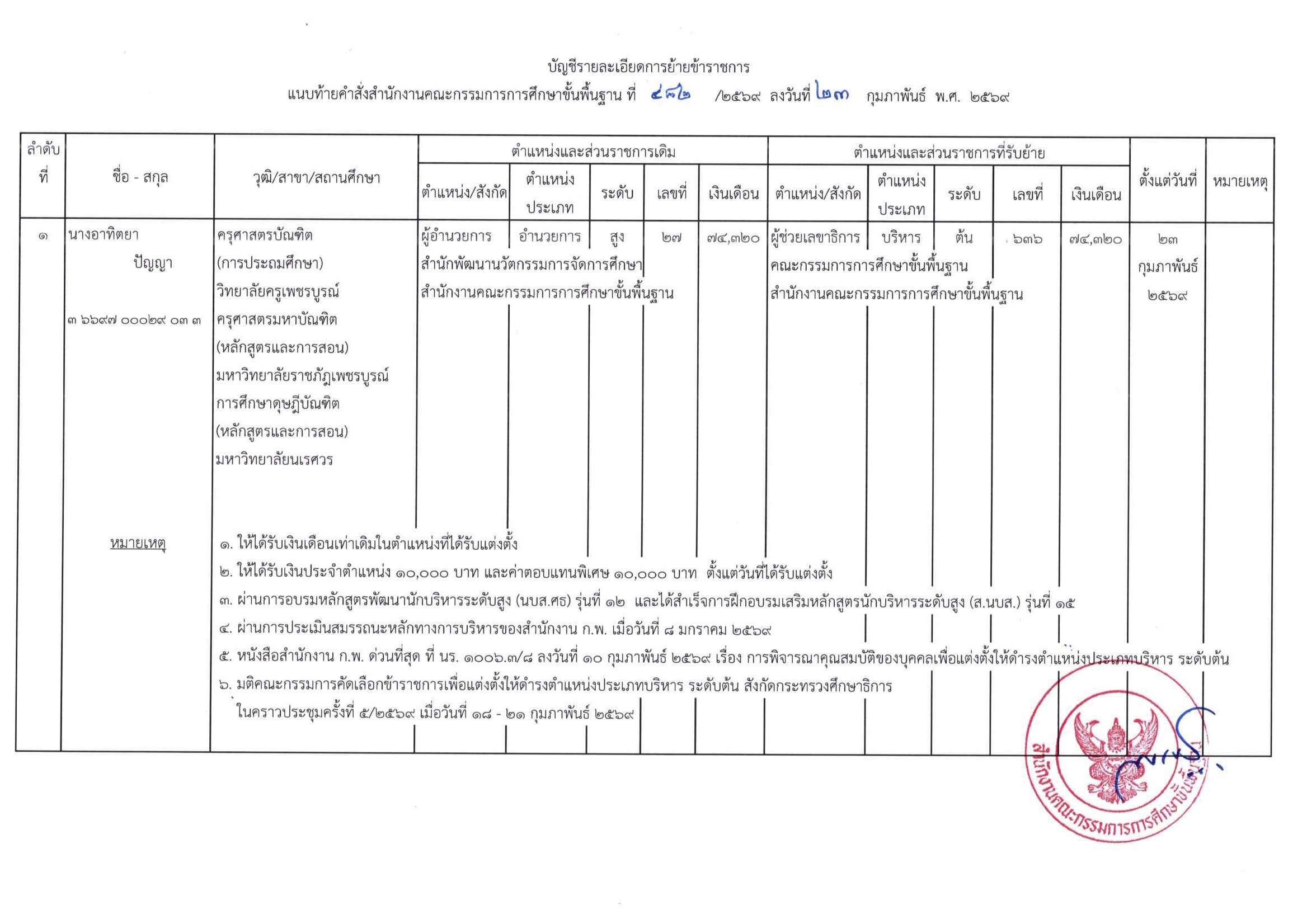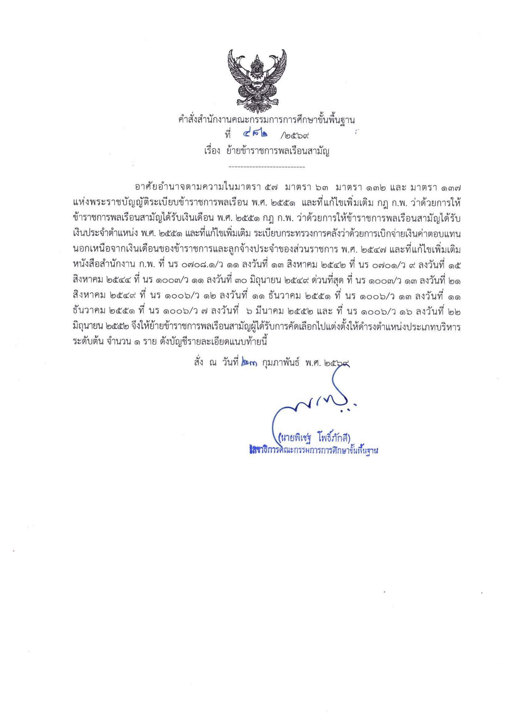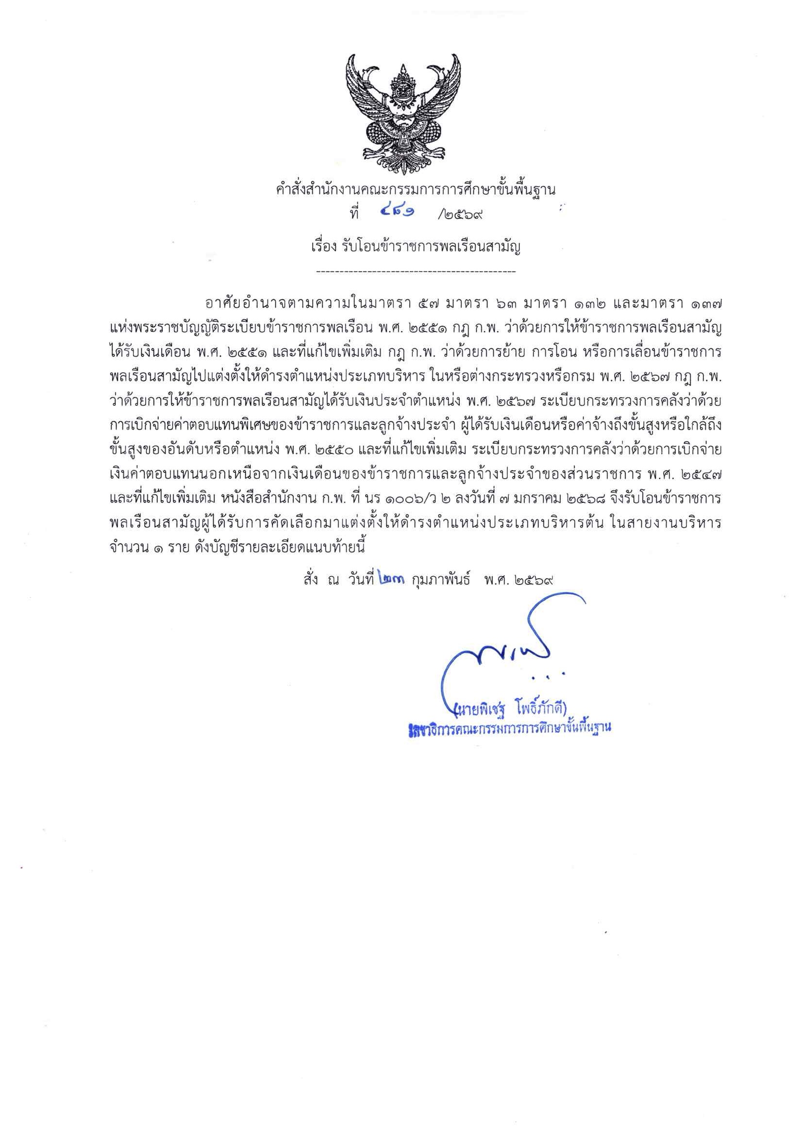 คำสั่ง สพฐ. เรื่อง รับโอนข้าราชการพลเรือนสามัญ และ คำสั่ง สพฐ. เรื่อง ย้ายข้าราชการพลเรือนสามัญ เพื่อแต่งตั้งให้ดำรงตำแหน่งประเภทบริหาร ระดับต้น ตำแหน่งผู้ช่วยเลขาธิการคณะกรรมการการศึกษาขั้นพื้นฐาน