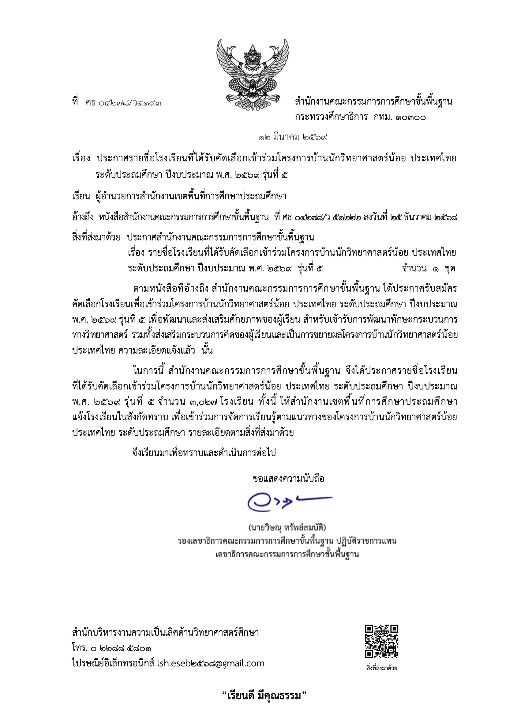 - ประกาศรายชื่อโรงเรียนที่ได้รับคัดเลือกเข้าร่วมโครงการบ้านนักวิทยาศาสตร์น้อย ประเทศไทย ระดับประถมศึกษา ปีงบประมาณ พ.ศ. 2569 รุ่นที่ 5 หรือ ลิงก์สำรอง