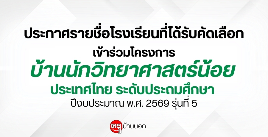 ประกาศรายชื่อโรงเรียนที่ได้รับคัดเลือกเข้าร่วมโครงการบ้านนักวิทยาศาสตร์น้อย ประเทศไทย ระดับประถมศึกษา ปีงบประมาณ พ.ศ. 2569 รุ่นที่ 5