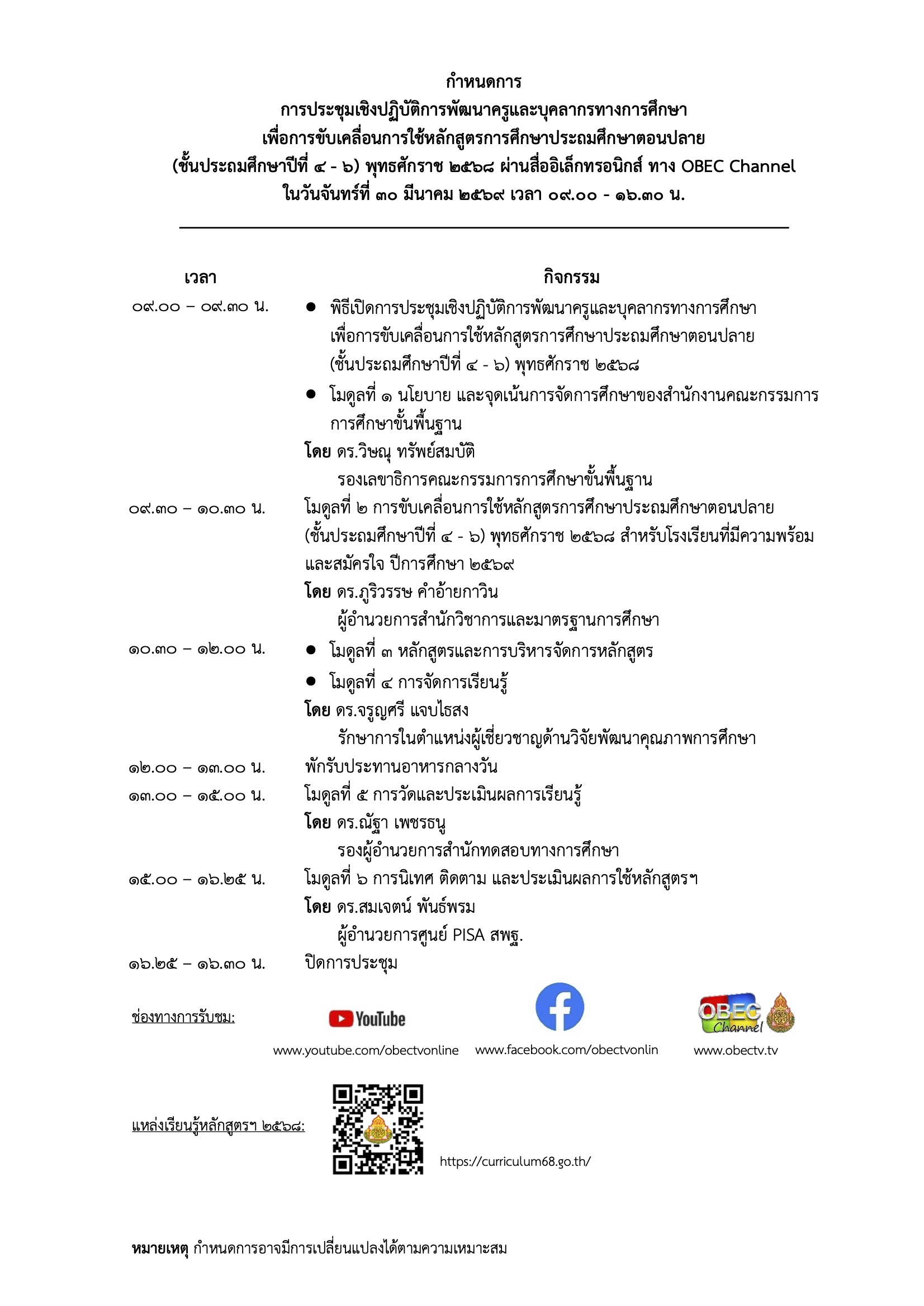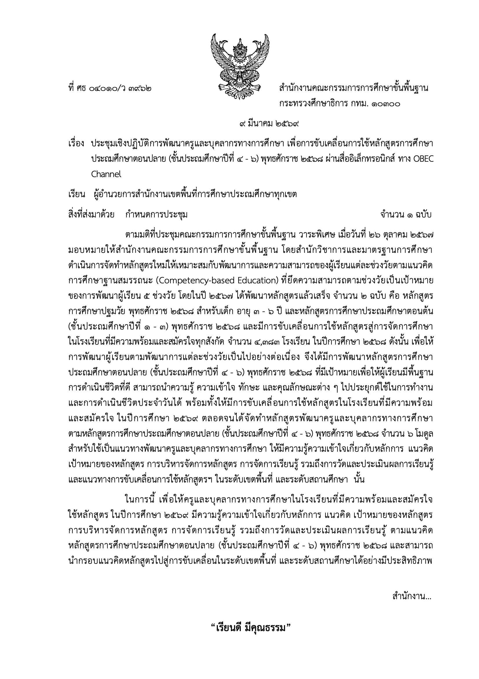 ประชุมเชิงปฏิบัติการพัฒนาครูและบุคลากรทางการศึกษา เพื่อการขับเคลื่อนการใช้หลักสูตรการศึกษาประถมศึกษาตอนปลาย (ชั้นประถมศึกษาปีที่ 4 - 6) พุทธศักราช 2568 ผ่านสื่ออิเล็กทรอนิกส์ ทาง OBEC Channel