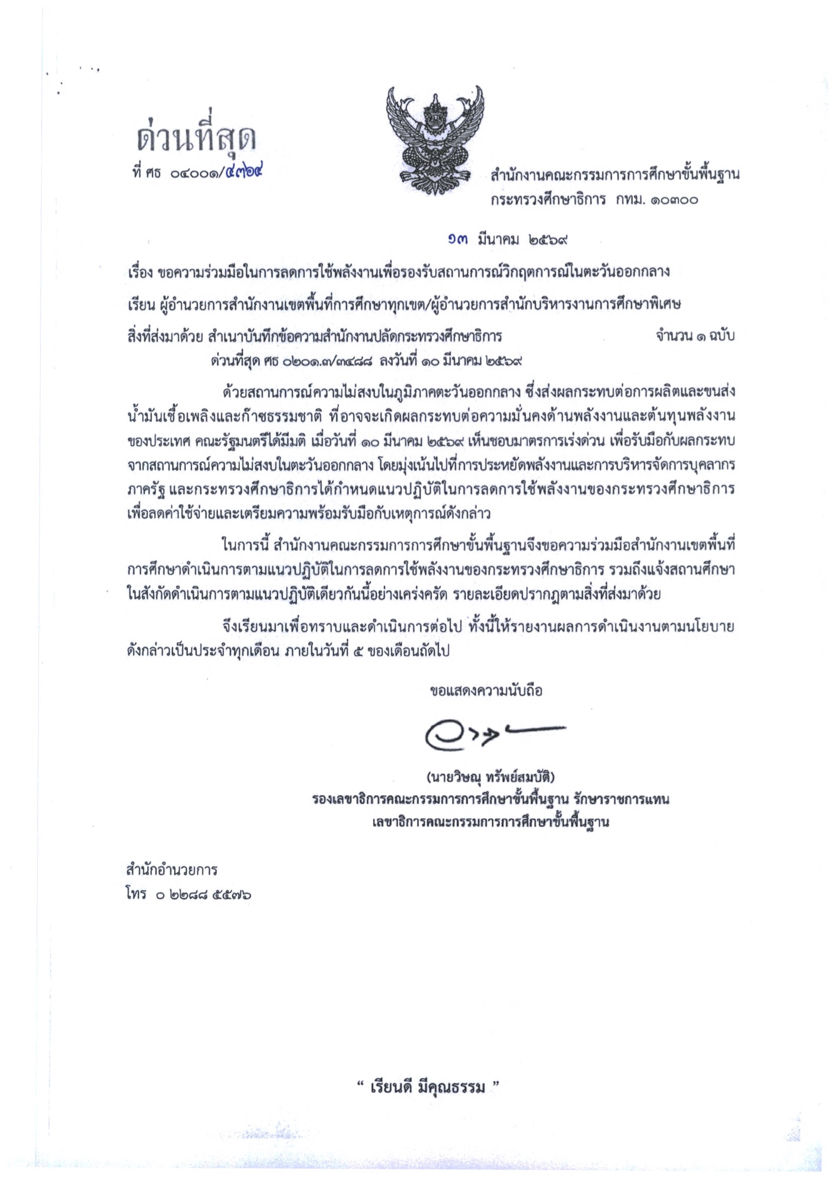 เมื่อวันที่ 13 มีนาคม 2569 นายวิษณุ ทรัพย์สมบัติ รองเลขาธิการคณะกรรมการการศึกษาขั้นพื้นฐาน (กพฐ.) ปฏิบัติราชการแทนเลขาธิการ กพฐ. ได้ลงนามในหนังสือที่ ศธ 04001/4364 เวียนแจ้งแนวปฏิบัติในการลดการใช้พลังงานของกระทรวงศึกษาธิการ เพื่อให้สอดคล้องกับมติคณะรัฐมนตรีเมื่อวันที่ 10 มีนาคม 2569 ที่เห็นชอบมาตรการเร่งด่วนในการประหยัดพลังงานและบริหารจัดการบุคลากรภาครัฐ