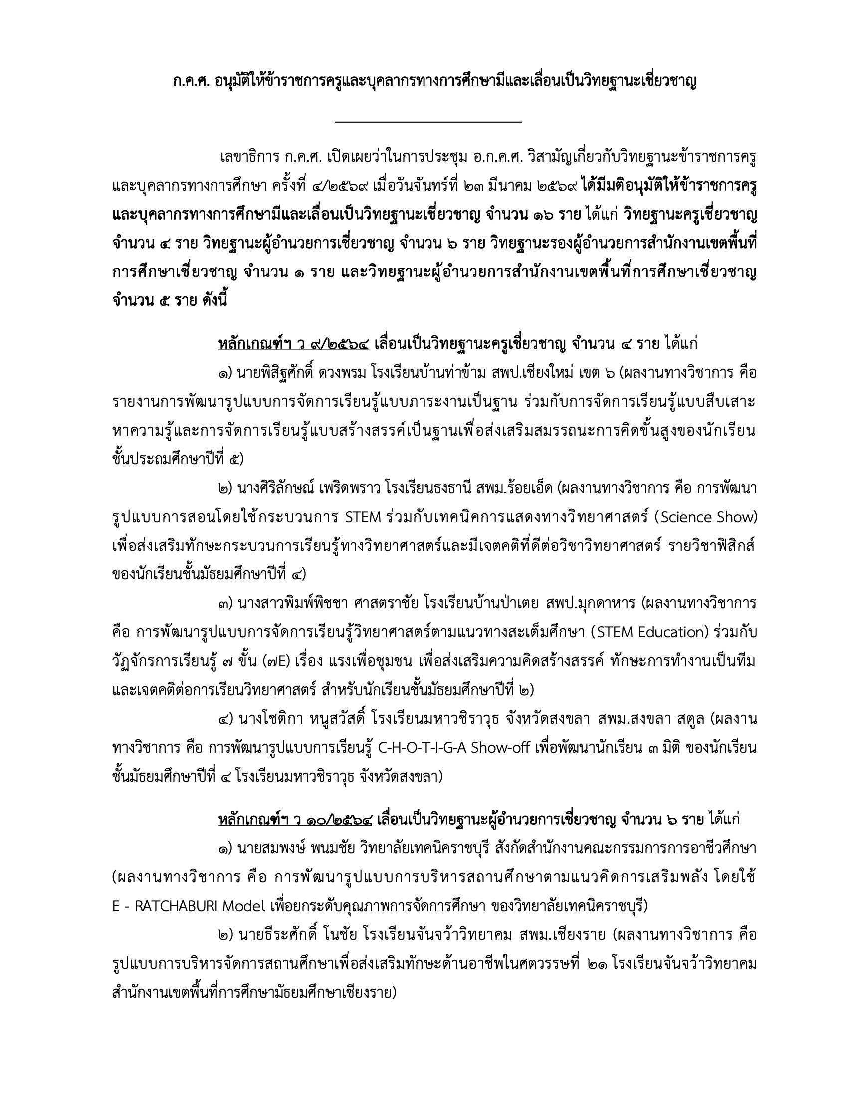 เลขาธิการ ก.ค.ศ.เปิดเผยว่า ในการประชุม อ.ก.ค.ศ.วิสามัญ เกี่ยวกับวิทยฐานะข้าราชการครู และบุคลากรทางการศึกษา ครั้งที่ 4/2569 เมื่อวันจันทร์ที่ 23 มีนาคม 2569 ได้มีมติอนุมัติให้ข้าราชการครู และบุคลากรทางการศึกษามีและเลื่อนเป็นวิทยฐานะเชี่ยวชาญ จำนวน 16 ราย ได้แก่