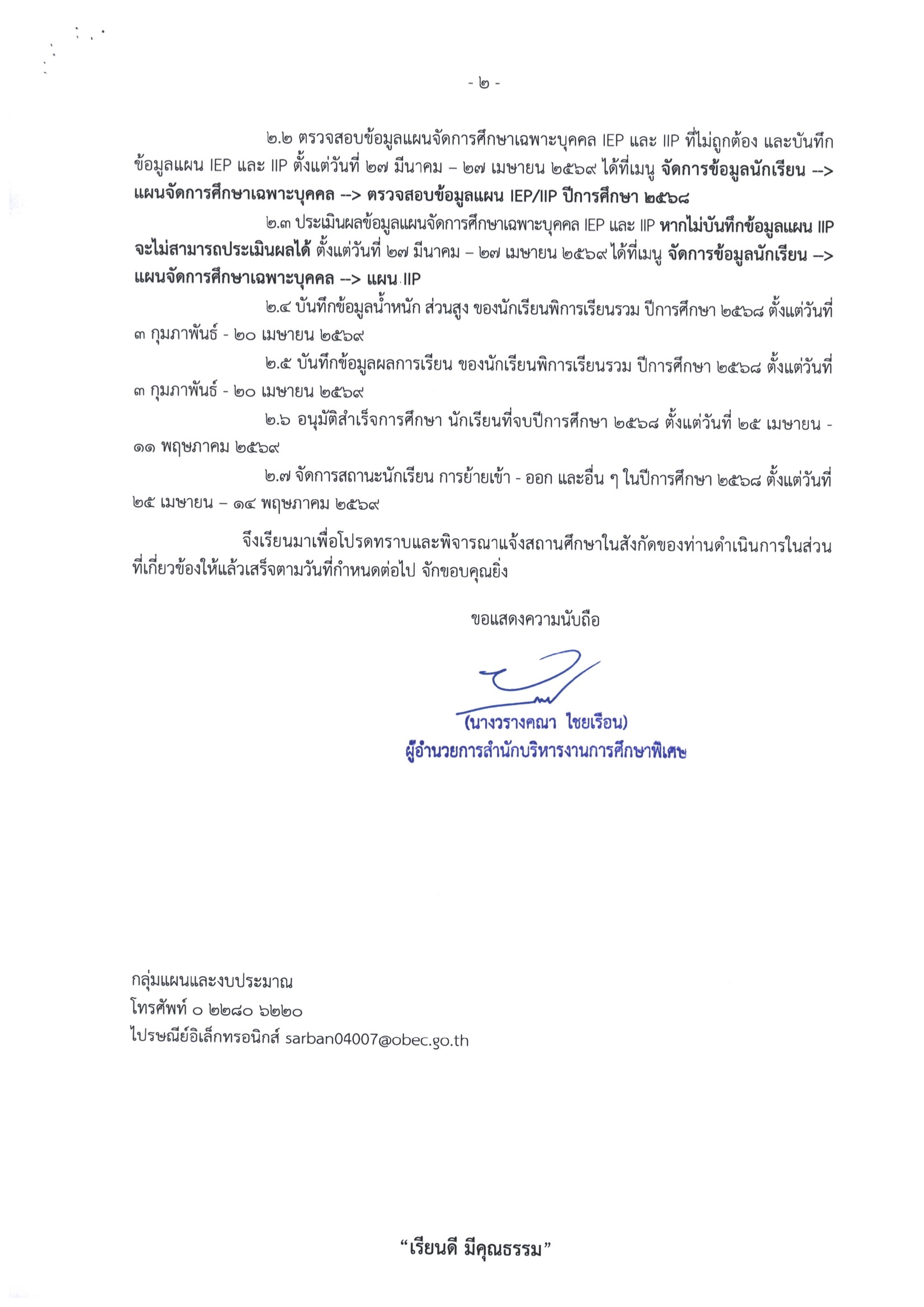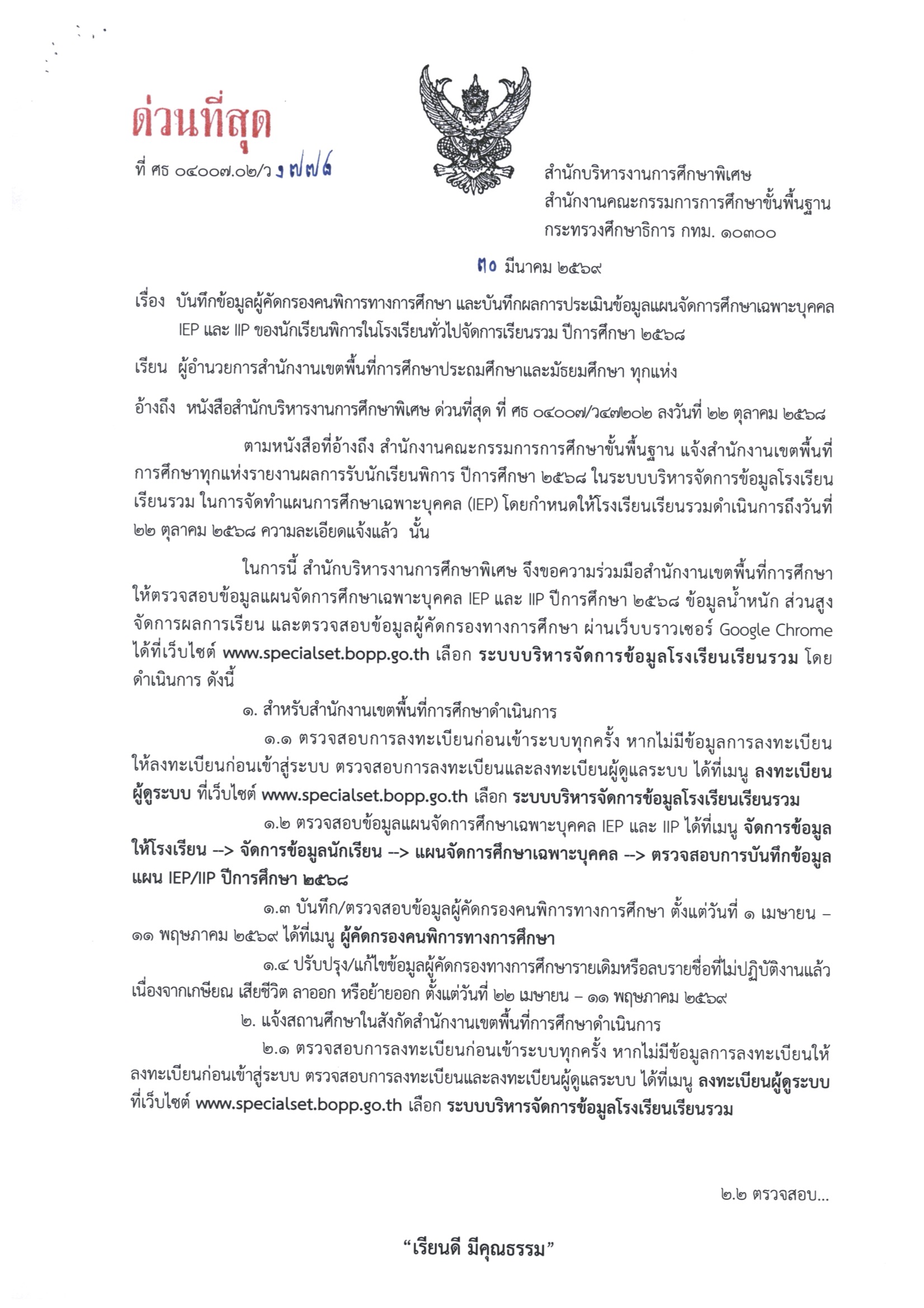 การบันทึกข้อมูลผู้คัดกรองคนพิการทางการศึกษา และบันทึกผลการประเมินข้อมูลแผนจัดการศึกษาเฉพาะบุคคล IEP และ IIP ของนักเรียนพิการในโรงเรียนทั่วไปจัดการเรียนรวม ปีการศึกษา 2568