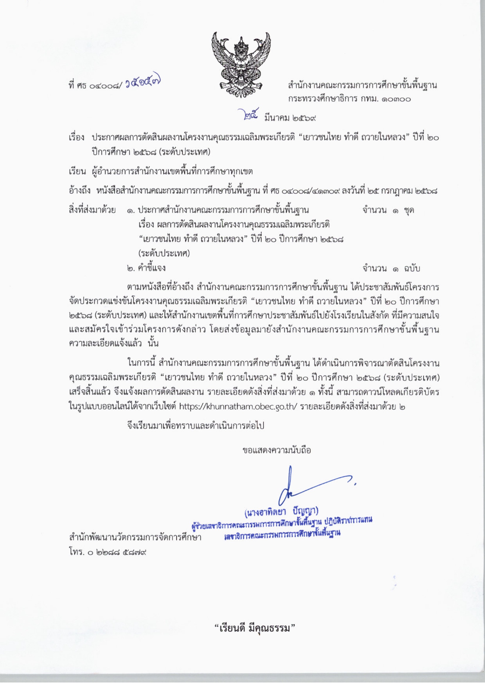 ประกาศผลการตัดสินผลงานโครงการคุณธรรมเฉลิมพระเกียรติ เยาวชนไทย ทำดีถวายในหลวง ปีที่ 20 ปีการศึกษา 2569 (ระดับประเทศ)