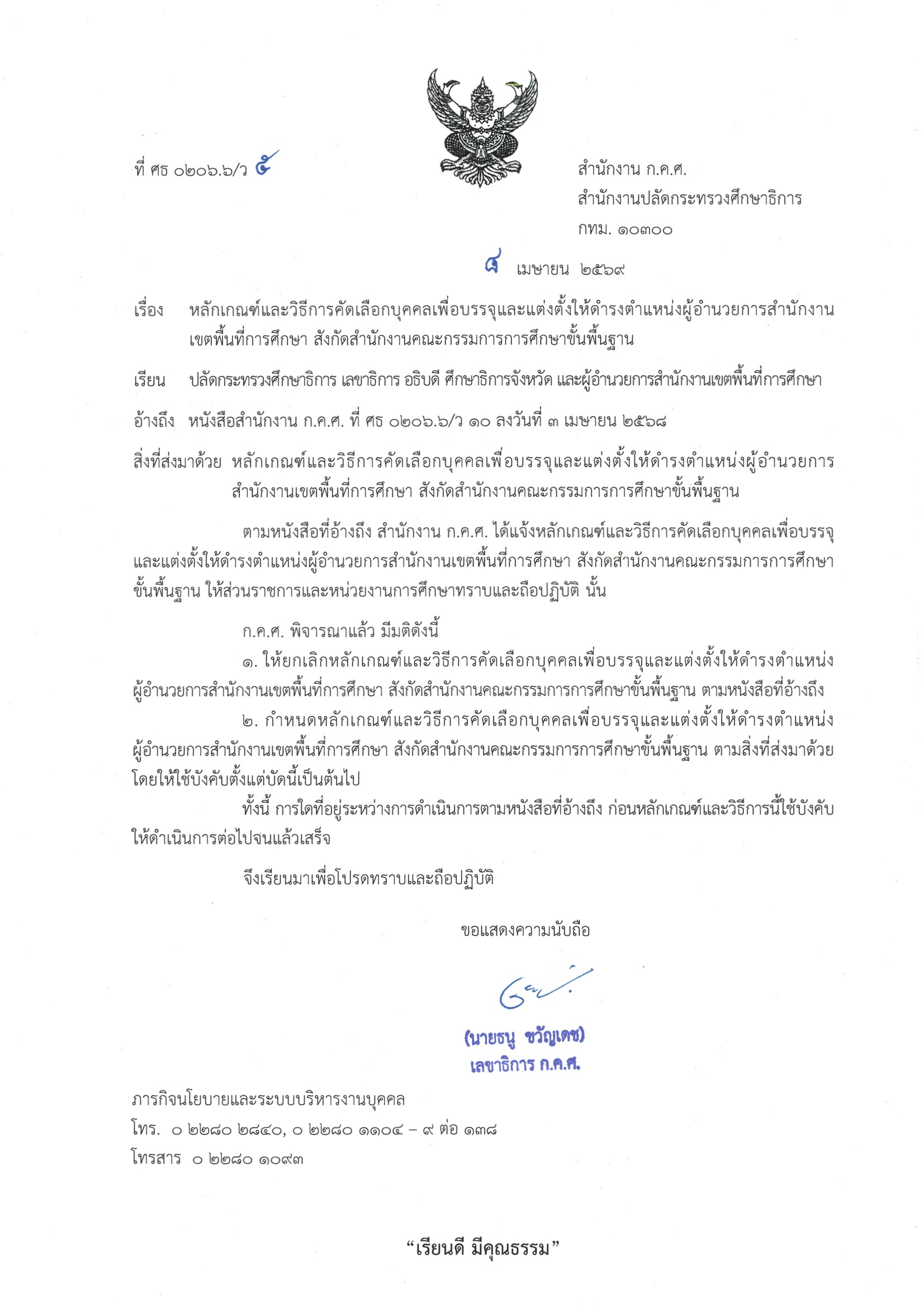 ว 5/2569 หลักเกณฑ์และวิธีการคัดเลือกบุคคลเพื่อบรรจุและแต่งตั้งให้ดำรงตำแหน่งผู้อำนวยการสำนักงานเขตพื้นที่การศึกษา สังกัดสำนักงานคณะกรรมการการศึกษาขั้นพื้นฐาน