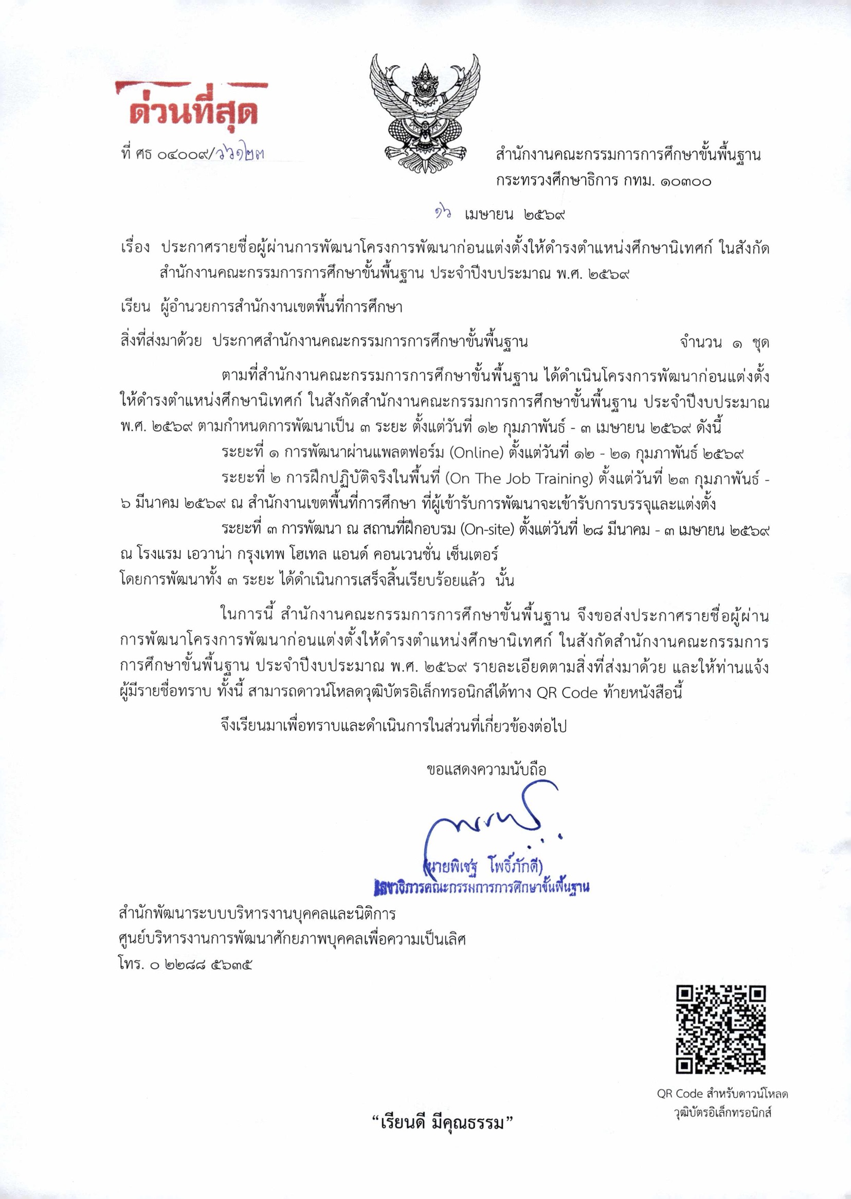 สพฐ.ประกาศรายชื่อผู้ผ่านการพัฒนาโครงการพัฒนาก่อนแต่งตั้งให้ดำรงตำแหน่งศึกษานิเทศก์ ประจำปีงบประมาณ พ.ศ. 2569