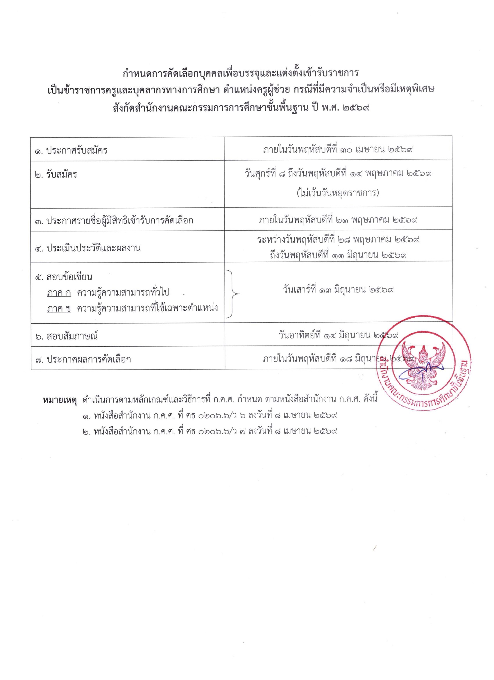 สำนักงานคณะกรรมการการศึกษาขั้นพื้นฐาน มีหนังสือ ด่วนที่สุด ที่ ศธ ศธ 04009/ว 6570 เรื่อง การคัดเลือกบุคคลเพื่อบรรจุและแต่งตั้งเข้ารับราชการเป็นข้าราชการครูและบุคลากรทางการศึกษา ตำแหน่งครูผู้ช่วย กรณีที่มีความจำเป็นหรือมีเหตุพิเศษ สังกัดสำนักงานคณะกรรมการการศึกษาขั้นพื้นฐาน ปี พ.ศ. 2569