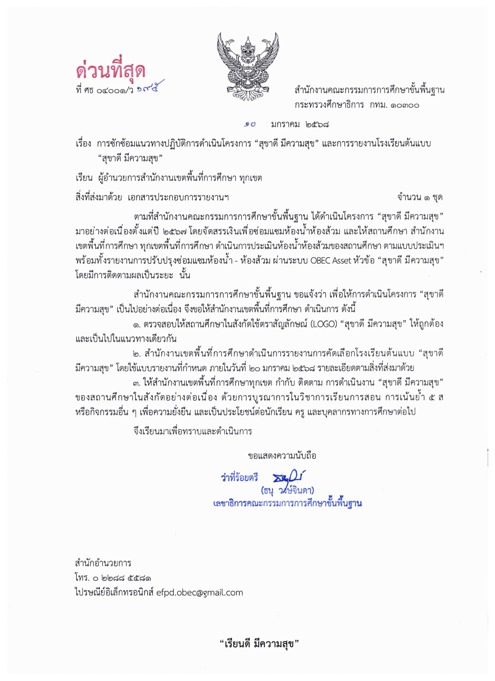 สำนักงานคณะกรรมการการศึกษาขั้นพื้นฐาน ขอแจ้งว่า เพื่อให้การดำเนินโครงการ "สุขาดี มีความสุข" เป็นไปอย่างต่อเนื่อง จึงขอให้สำนักงานเขตพื้นที่การศึกษา ดำเนินการ ดังนี้