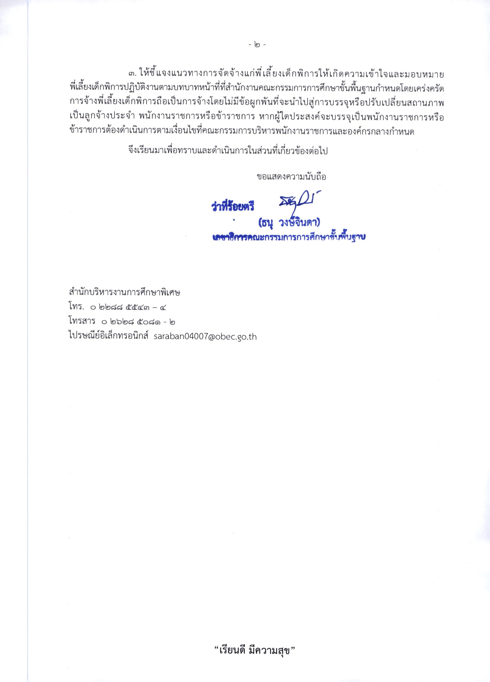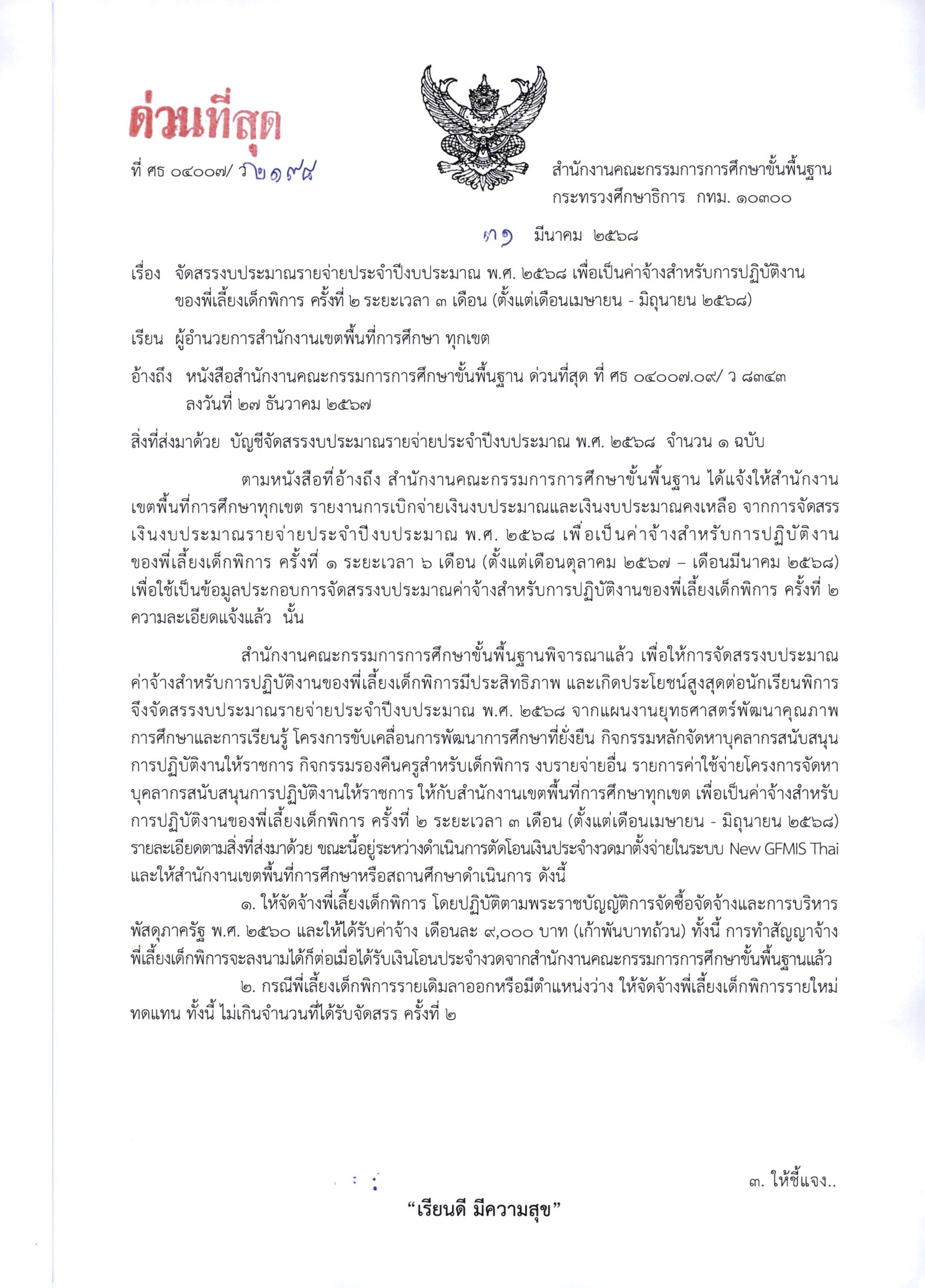 สพฐ.จัดสรรงบประมาณรายจ่ายประจำปีงบประมาณ พ.ศ. 2568 เพื่อเป็นค่าจ้างสำหรับการปฏิบัติงานของพี่เลี้ยงเด็กพิการ ครั้งที่ 2 ระยะเวลา 3 เดือน (ตั้งแต่เดือนเมษายน - มิถุนายน 2568)