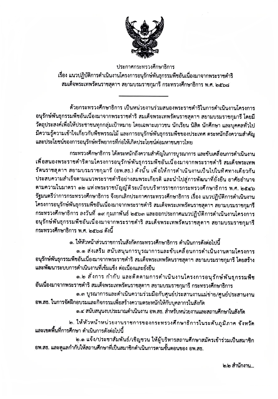 ประกาศกระทรวงศึกษาธิการ "แนวปฏิบัติการดําเนินงานโครงการอนุรักษ์พันธุกรรมพืชอันเนื่องมาจากพระราชดําริ สมเด็จพระเทพรัตนราชสุดาฯ สยามบรมราชกุมารี กระทรวงศึกษาธิการ พ.ศ. 2568"