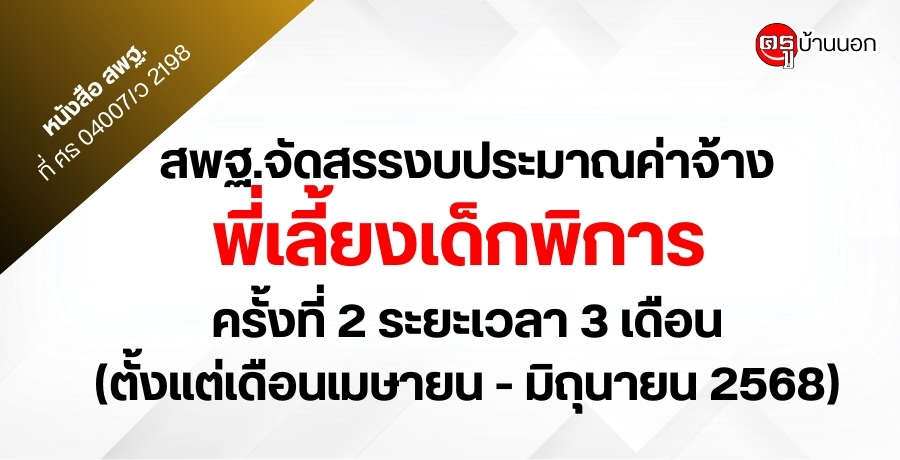 สพฐ.แจ้งจัดสรรงบประมาณรายจ่ายประจำปีงบประมาณ พ.ศ. 2569 เพื่อเป็นค่าจ้างสำหรับการปฏิบัติงาน ของพี่เลี้ยงเด็กพิการ ครั้งที่ 1 ระยะเวลา 4 เดือน (ตั้งแต่เดือน ต.ค. 2568 - ม.ค. 2569)