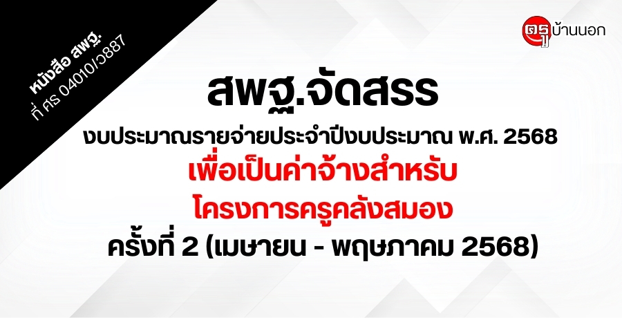 สพฐ.จัดสรรงบประมาณรายจ่ายประจำปีงบประมาณ พ.ศ. 2569 เพื่อเป็นค่าจ้างสำหรับโครงการครูคลังสมอง ครั้งที่ 1 (ตุลาคม 2568 - มีนาคม 2569)