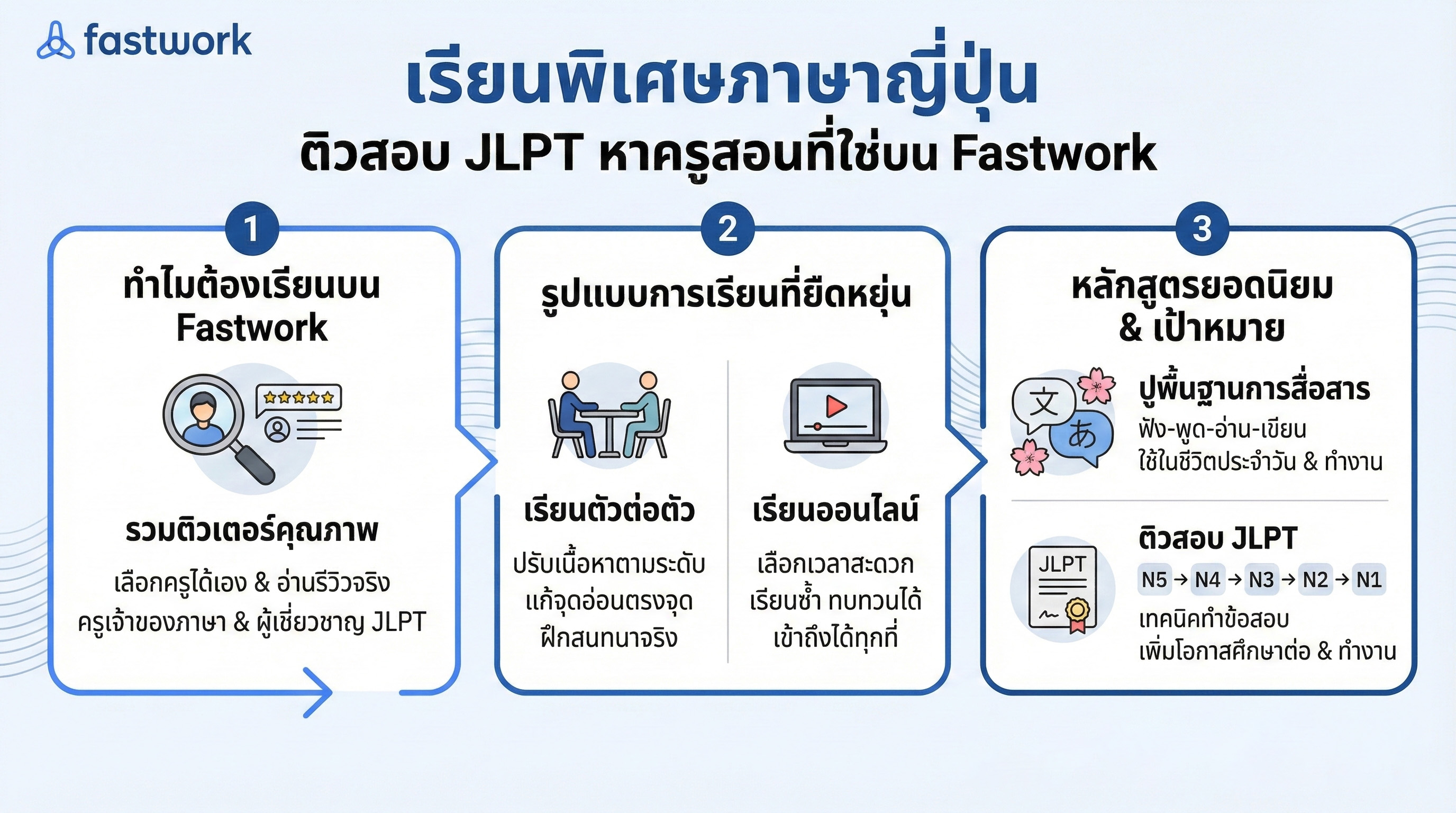 การเรียนภาษาญี่ปุ่นไม่ใช่เรื่องยาก แต่ความสำเร็จของผู้เรียนขึ้นอยู่กับการเลือกติวเตอร์ที่เหมาะสมกับเป้าหมายและสไตล์การเรียนของตนเอง สำหรับผู้ที่ต้องการเรียนพิเศษภาษาญี่ปุ่น ไม่ว่าจะเพื่อสนทนาในชีวิตประจำวัน เตรียมสอบ JLPT หรือใช้ภาษาญี่ปุ่นในการทำงาน Fastwork คือแพลตฟอร์มที่รวบรวมติวเตอร์มืออาชีพไว้ครบทุกระดับ ทำให้ผู้เรียนเลือกติวเตอร์ได้ตรงตามความต้องการ