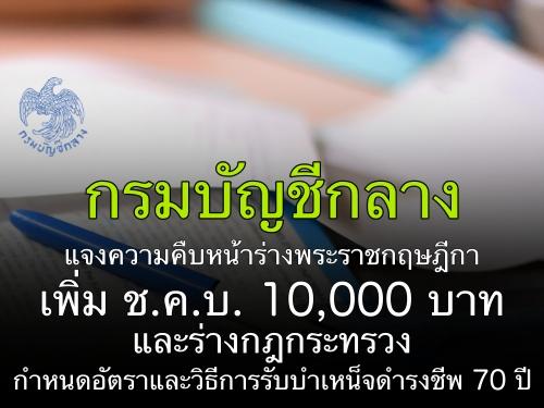 กรมบัญชีกลางแจงความคืบหน้าร่างพระราชกฤษฎีกาเพิ่ม ช.ค.บ. 10,000 บาท และร่างกฎกระทรวงกำหนดอัตราและวิธีการรับบำเหน็จดำรงชีพ 70 ปี