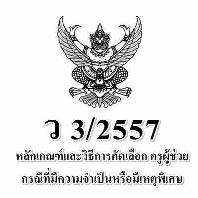 ว3/2557 หลักเกณฑ์และวิธีการคัดเลือกบุคคลเพื่อบรรจุและแต่งตั้งฯ ครูผู้ช่วย กรณีพิเศษ