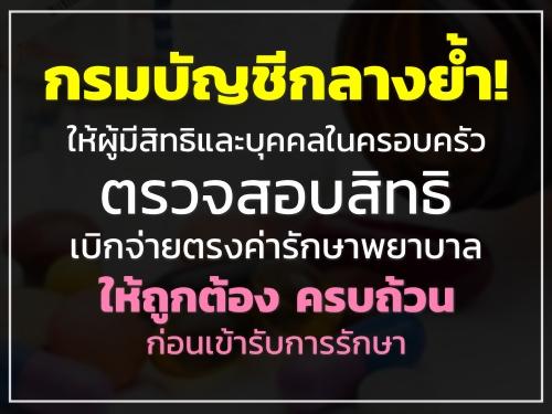 กรมบัญชีกลางย้ำ! ให้ผู้มีสิทธิและบุคคลในครอบครัวตรวจสอบสิทธิเบิกจ่ายตรงค่ารักษาพยาบาล ให้ถูกต้อง ครบถ้วน ก่อนเข้ารับการรักษา เพื่อรักษาประโยชน์ของตนเอ