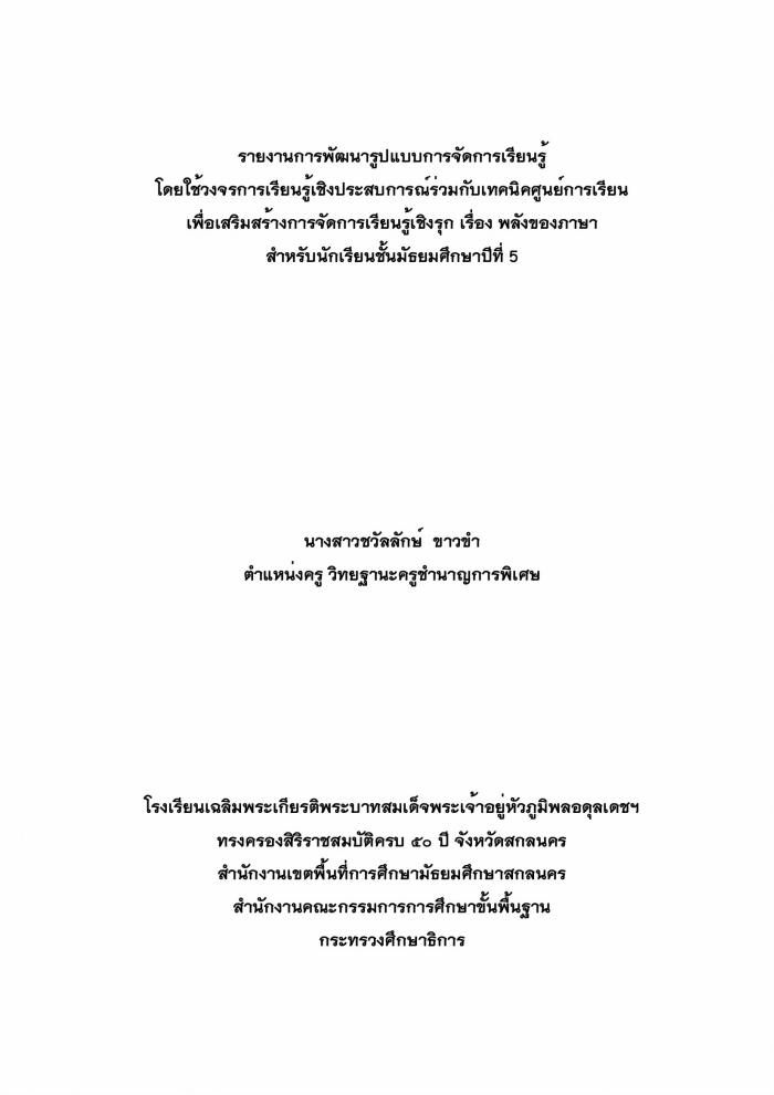 รายงานการพัฒนารูปแบบการจัดการเรียนรู้ โดยใช้วงจรการเรียนรู้เชิงประสบการณ์ร่วมกับเทคนิคศูนย์การเรียน เพื่อเสริมสร้างการจัดการเรียนรู้เชิงรุก เรื่อง พลังของภาษา สำหรับนักเรียนชั้นมัธยมศึกษาปีที่ 5 : ชวัลลักษ์ ขาวขำ