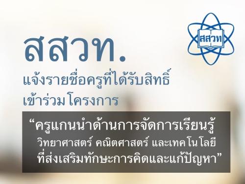 สสวท.แจ้งรายชื่อครูที่ได้รับสิทธิ์เข้าร่วมโครงการ "ครูแกนนำด้านการจัดการเรียนรู้วิทยาศาสตร์ คณิตศาสตร์ และเทคโนโลยีที่ส่งเสริมทักษะการคิดและแก้ปัญหา"