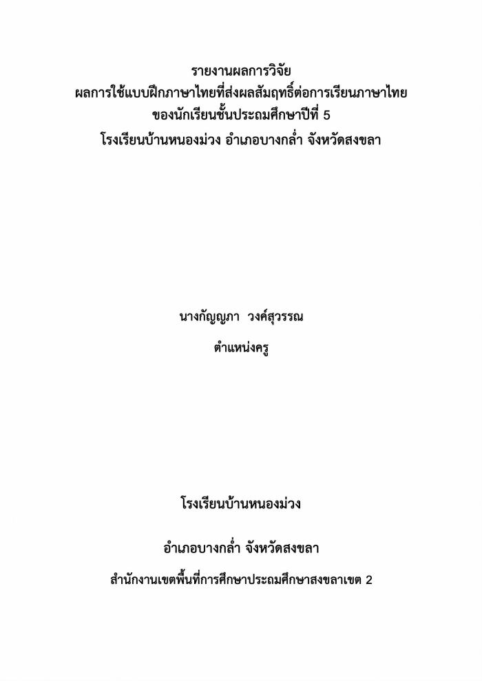 รายงานผลการวิจัย ผลการใช้แบบฝึกภาษาไทยที่ส่งผลสัมฤทธิ์ต่อการเรียนภาษาไทย ของนักเรียนชั้นประถมศึกษาปีที่ 5 โรงเรียนบ้านหนองม่วง : กัญญภา วงค์สุวรรณ