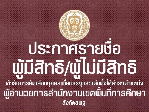 ประกาศรายชื่อผู้มีสิทธิ/ผู้ไม่มีสิทธิ เข้ารับการคัดเลือกบุคคลเพื่อบรรจุและแต่งตั้งให้ดำรงตำแหน่งผู้อำนวยการสำนักงานเขตพื้นที่การศึกษา สังกัดสพฐ.