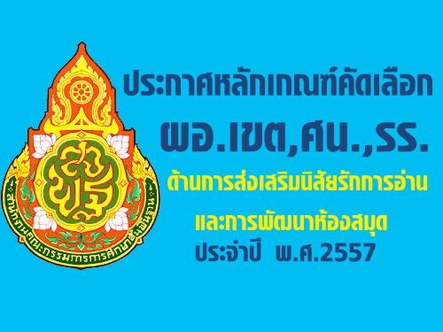 ประกาศหลักเกณฑ์การคัดเลือกผอ.สพท.,ศน.และสถานศึกษา "ด้านการส่งเสริมนิสัยรักการอ่านและการพัฒนาห้องสมุด" ประจำปี พ.ศ. 2557
