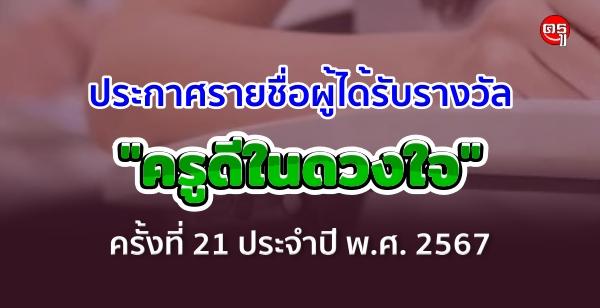 ประกาศรายชื่อผู้ได้รับรางวัล "ครูดีในดวงใจ" ครั้งที่ 21 ประจำปี พ.ศ. 2567