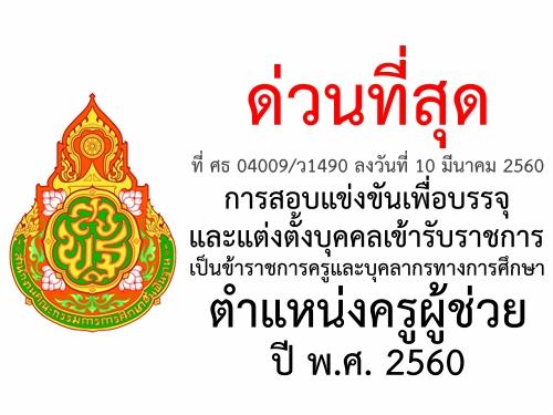 ด่วนที่สุด ที่ ศธ 04009/ว1782 การสอบแข่งขันเพื่อบรรจุและแต่งตั้งเข้ารับราชการเป็นข้าราชการครูและบุคลากรทางการศึกษา ตำแหน่งครูผู้ช่วย ปี พ.ศ.2560
