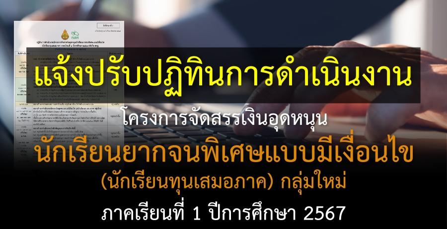 แจ้งปรับปฏิทินการดำเนินงานโครงการจัดสรรเงินอุดหนุนนักเรียนยากจนพิเศษแบบมีเงื่อนไข (นักเรียนทุนเสมอภาค) กลุ่มใหม่ ภาคเรียนที่ 1 ปีการศึกษา 2567