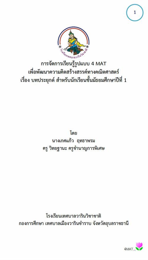 การจัดการเรียนรู้รูปแบบ 4 MAT เพื่อพัฒนาความคิดสร้างสรรค์ทางคณิตศาสตร์ เรื่อง บทประยุกต์ สำหรับนักเรียน ม.1 ผลงานครูเกศแก้ว ฤทธาพรม