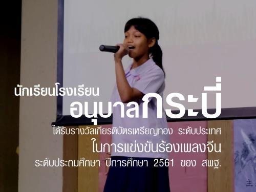 นักเรียนโรงเรียนอนุบาลกระบี่ ได้รับรางวัลเกียรติบัตรเหรียญทอง ระดับประเทศ ในการแข่งขันร้องเพลงจีน ระดับประถมศึกษา ปีการศึกษา 2561 ของ สพฐ.