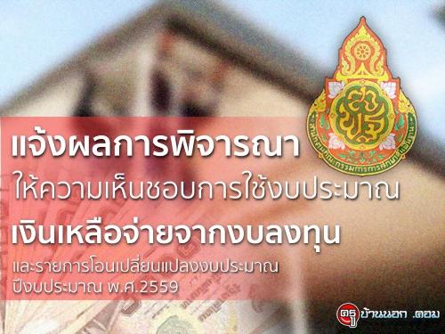 แจ้งผลการพิจารณาให้ความเห็นชอบการใช้งบประมาณเงินเหลือจ่ายจากงบลงทุน และรายการโอนเปลี่ยนแปลงงบประมาณ ปีงบประมาณ พ.ศ.2559