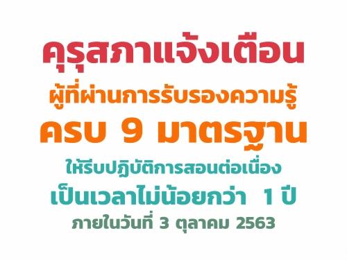 คุรุสภาแจ้งเตือนผู้ที่ผ่านการรับรองความรู้ครบ 9 มาตรฐาน ให้รีบปฏิบัติการสอนต่อเนื่องเป็นเวลาไม่น้อยกว่า 1 ปี ภายในวันที่ 3 ตุลาคม 2563