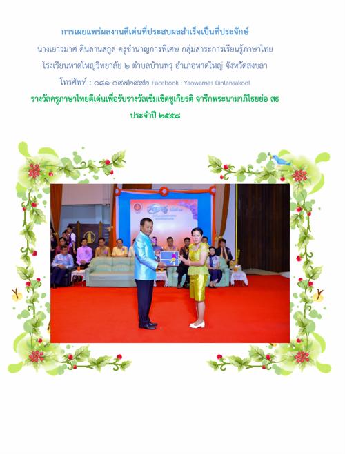 เผยแพร่ผลงานดีเด่นที่ประสบผลสำเร็จเป็นที่ประจักษ์ จำนวน 3 รางวัล และข้อตกลงในการพัฒนางาน ของ นางเยาวมาศ ดินลานสกูล