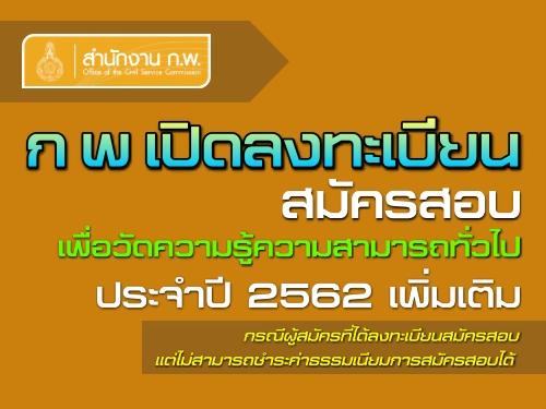 ก.พ.เปิดลงทะเบียนสมัครสอบเพื่อวัดความรู้ความสามารถทั่วไปประจำปี 2562 เพิ่มเติม (กรณีผู้สมัครที่ได้ลงทะเบียนสมัครสอบ แต่ไม่สามารถชำระค่าธรรมเนียมได้)