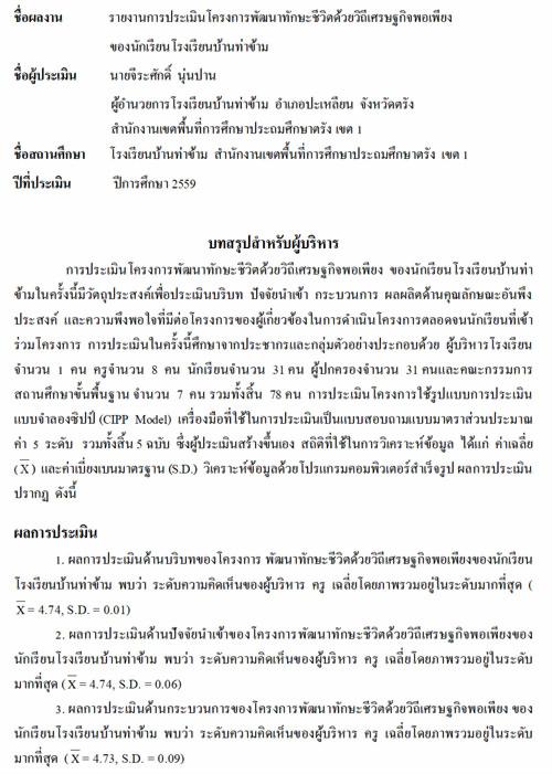 รายงานการประเมินโครงการพัฒนาทักษะชีวิตด้วยวิถีเศรษฐกิจพอเพียง ของนักเรียนโรงเรียนบ้านท่าข้าม ผลงานนายจีระศักดิ์ นุ่นปาน