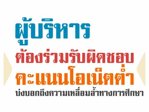 ผู้บริหารต้องร่วมรับผิดชอบคะแนนโอเน็ตต่ำ บ่งบอกถึงความเหลื่อมล้ำทางการศึกษา อ่านต่อคลิก[25 เม.ย. 2561](อ่าน 17,945 ครั้ง) (0.51%-314 ผู้โหวต) |
