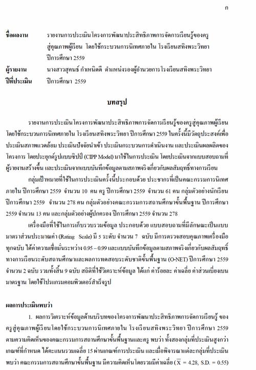 รายงานการประเมินโครงการพัฒนาประสิทธิภาพการจัดการเรียนรู้ของครู สู่คุณภาพผู้เรียน โดยใช้กระบวนการนิเทศภายใน โรงเรียนสทิงพระวิทยา ปีการศึกษา 2559