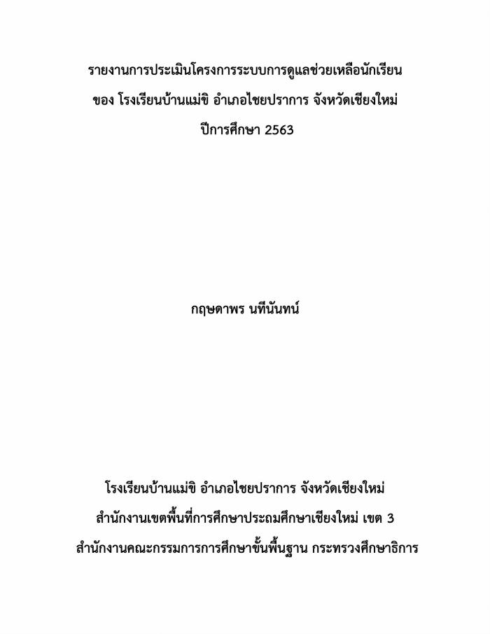 รายงานการประเมินโครงการระบบการดูแลช่วยเหลือนักเรียนของ โรงเรียนบ้านแม่ขิ อำเภอไชยปราการ จังหวัดเชียงใหม่ปีการศึกษา 2563