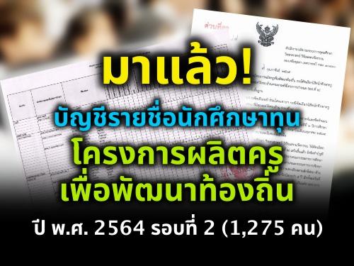 มาแล้ว! บัญชีรายชื่อนักศึกษาทุนโครงการผลิตครูเพื่อพัฒนาท้องถิ่น ปี พ.ศ. 2564 รอบที่ 2 (1,275 คน)