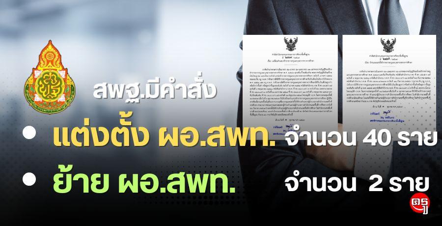 สพฐ.มีคำสั่งแต่งตั้งข้าราชการครูและบุคลากรทางการศึกษาให้ดำรงตำแหน่งผู้อำนวยการสำนักงานเขตพื้นที่การศึกษา จำนวน 40 ราย และย้าย ผอ.สพท.เพิ่มเติม 2 ราย