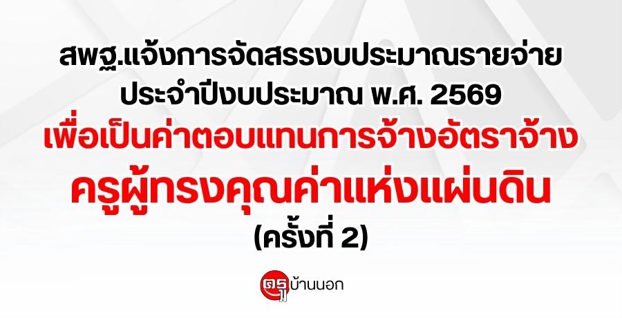 สพฐ.แจ้งการจัดสรรงบประมาณรายจ่ายประจำปีงบประมาณ พ.ศ. 2569 เพื่อเป็นค่าตอบแทนการจ้างอัตราจ้างครูผู้ทรงคุณค่าแห่งแผ่นดิน (ครั้งที่ 2)
