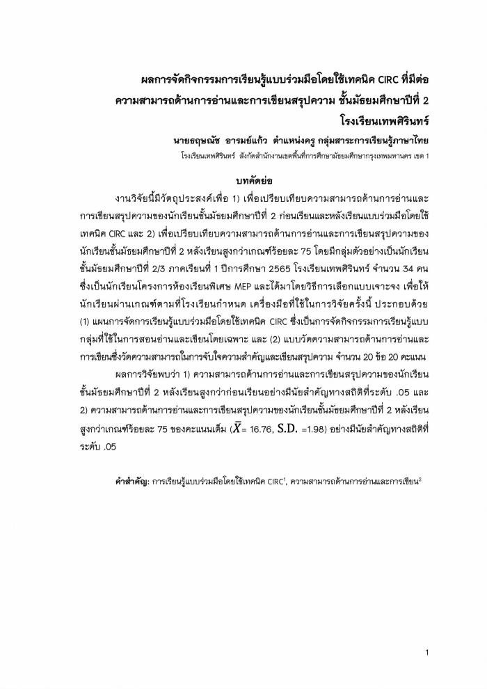 ผลการจัดกิจกรรมการเรียนรู้แบบร่วมมือโดยใช้เทคนิค CIRC ที่มีต่อความสามารถด้านการอ่านและการเขียนสรุปความ ชั้นมัธยมศึกษาปีที่ 2 : ธฤษณัช อารมย์แก้ว