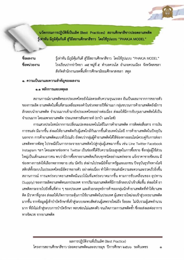 นวัตกรรมการปฏิบัติที่เป็นเลิศ (Best PracticEs) สถานศึกษาสีขาวปลอดยาเสพติด รู้เท่าทัน มีภูมิคุ้มกันดี สู่วิถีสถานศึกษาสีขาว โดยใช้รูปแบบ "PHAKJA MODEL" : โรงเรียนปากจ่าวิทยา