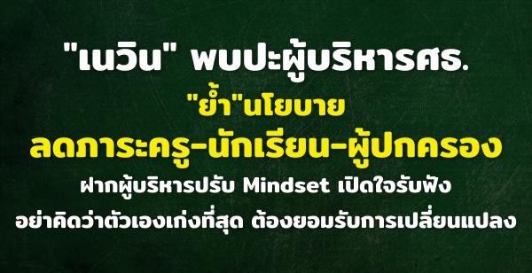 "เนวิน" พบปะผู้บริหารศธ. "ย้ำ"นโยบายลดภาระครู-นักเรียน-ผู้ปกครอง ฝากผู้บริหารปรับ Mindset เปิดใจรับฟัง อย่าคิดว่าตัวเองเก่งที่สุด ต้องยอมรับการเปลี่ยนแปลง