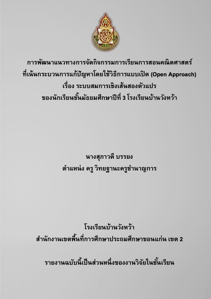 การพัฒนาแนวทางการจัดกิจกรรมการเรียนการสอนคณิตศาสตร์ที่เน้นกระบวนการแก้ปัญหาโดยใช้วิธีการแบบเปิด (OPEN Approach) เรื่อง ระบบสมการเชิงเส้นสองตัวแปร : สุภาวดี บรรยง