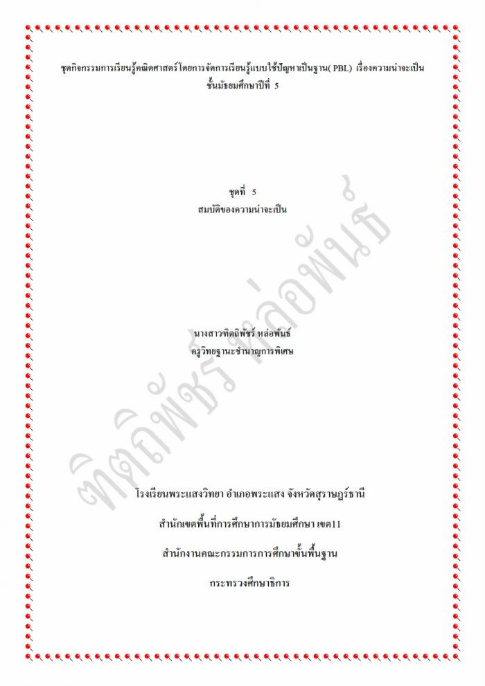 ชุดกิจกรรมการเรียนรู้คณิตศาสตร์โดยการจัดการเรียนรู้แบบใช้ปัญหาเป็นฐาน( PBL) เรื่องความน่าจะเป็น ผลงานครูฑิตถิพัชร์ หล่อพันธ์