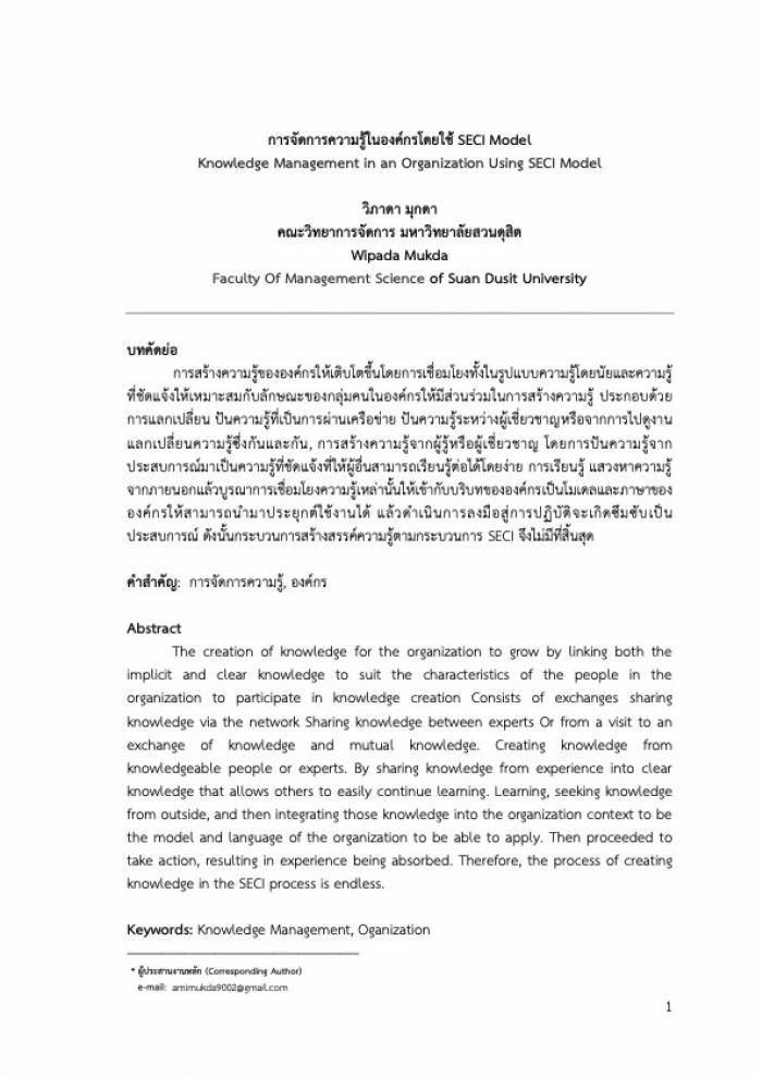 การจัดการความรู้ในองค์กรโดยใช้ SECI Model Knowledge Management in an Organization Using SECI Model : วิภาดา มุกดา