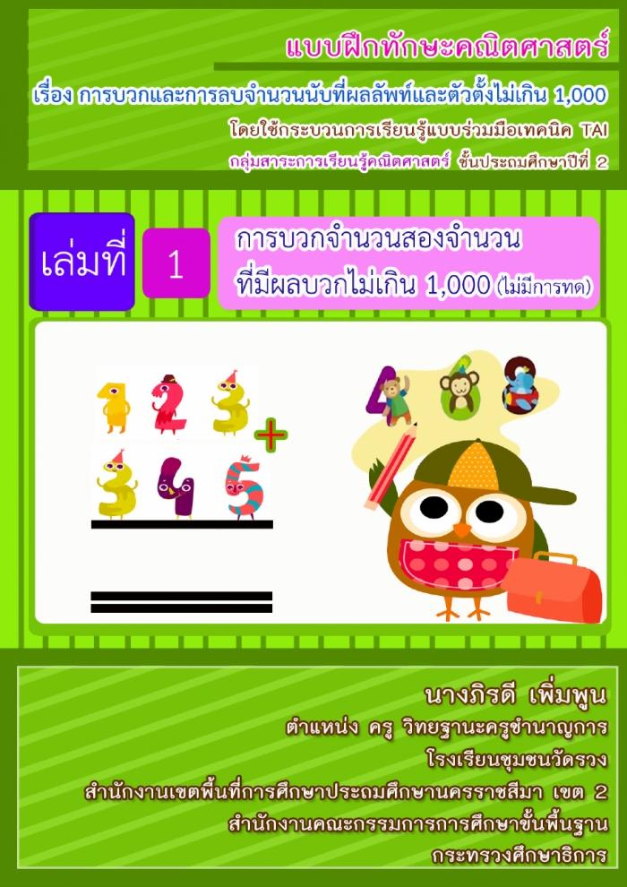แบบฝึกทักษะคณิตศาสตร์ เรื่อง การบวกและการลบจำนวนนับที่ผลลัพท์และตัวตั้งไม่เกิน 1,000 โดยใช้กระบวนการเรียนรู้แบบร่วมมือเทคนิคTAI ผลงานครูภิรดี เพิ่มพูน